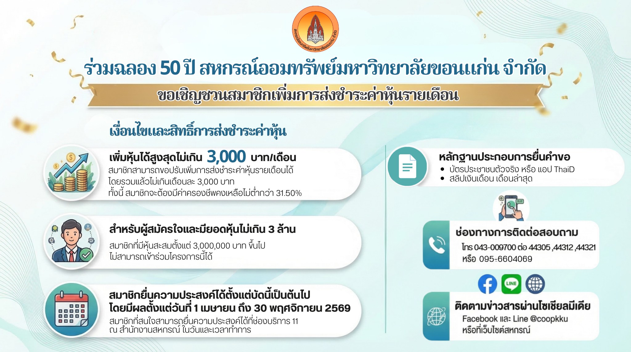 ประกาศฉบับที่ 11/2569 เรื่องเปิดให้สมาชิกขอเพิ่มการส่งชำระค่าหุ้นรายเดือนเนื่องในโอกาสครบรอบ 50 ปี