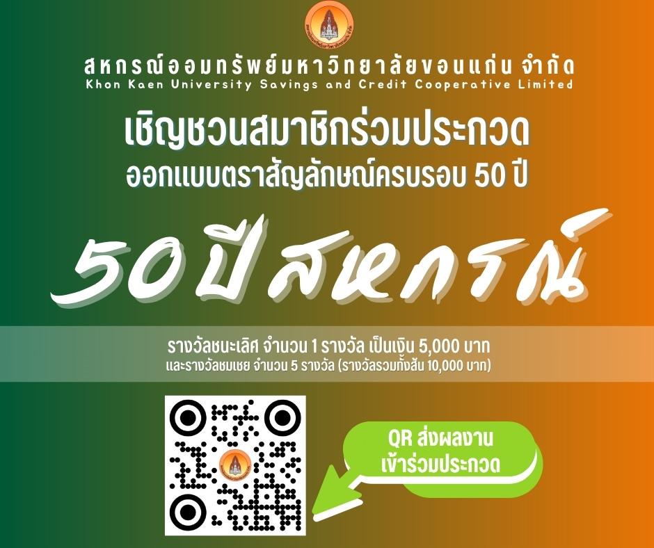 สหกรณ์ออมทรัพย์มหาวิทยาลัยขอนแก่น จำกัด ได้ดำเนินงานเพื่อส่งเสริมการออมและยกระดับคุณภาพชีวิตของสมาชิกมาอย่างต่อเนื่อง และในโอกาสครบรอบ 50 ปีแห่งการก่อตั้งสหกรณ์ ถือเป็นวาระสำคัญที่สะท้อนถึงความมั่นคง ความสำเร็จ และการเติบโตอย่างยั่งยืน เพื่อเปิดโอกาสให้สมาชิกมีส่วนร่วมในการออกแบบอัตลักษณ์ขององค์กร และส่งเสริมความภาคภูมิใจร่วมกัน สหกรณ์จึงจัดทำโครงการประกวดออกแบบตราสัญลักษณ์ (Logo) ครบรอบ 50 ปีขึ้น