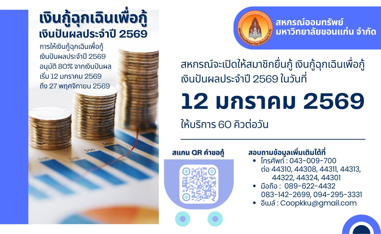 2.1 สมาชิกผู้สนใจสามารถสมัครเข้าร่วมโครงการด้วยตนเองได้ตั้งแต่วันที่ 19-30 สิงหาคม 2562 ณ สหกรณ์ออมทรัพย์มหาวิทยาลัยขอนแก่น จำกัด