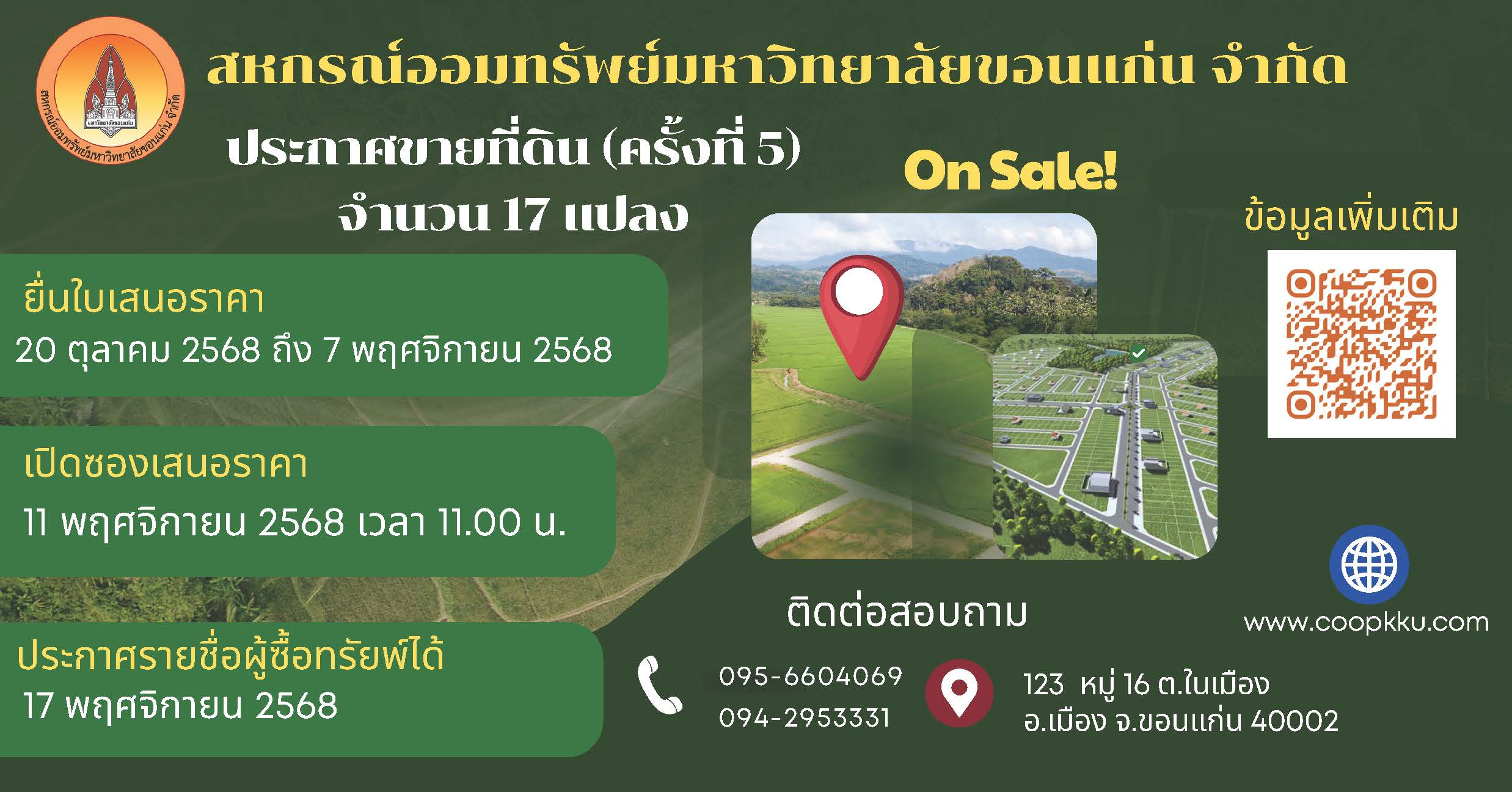 ประกาศ ฉบับที่ 42/2568 เรื่อง ขายที่ดินสหกรณ์ออมทรัพย์มหาวิทยาลัยขอนแก่น จำกัด