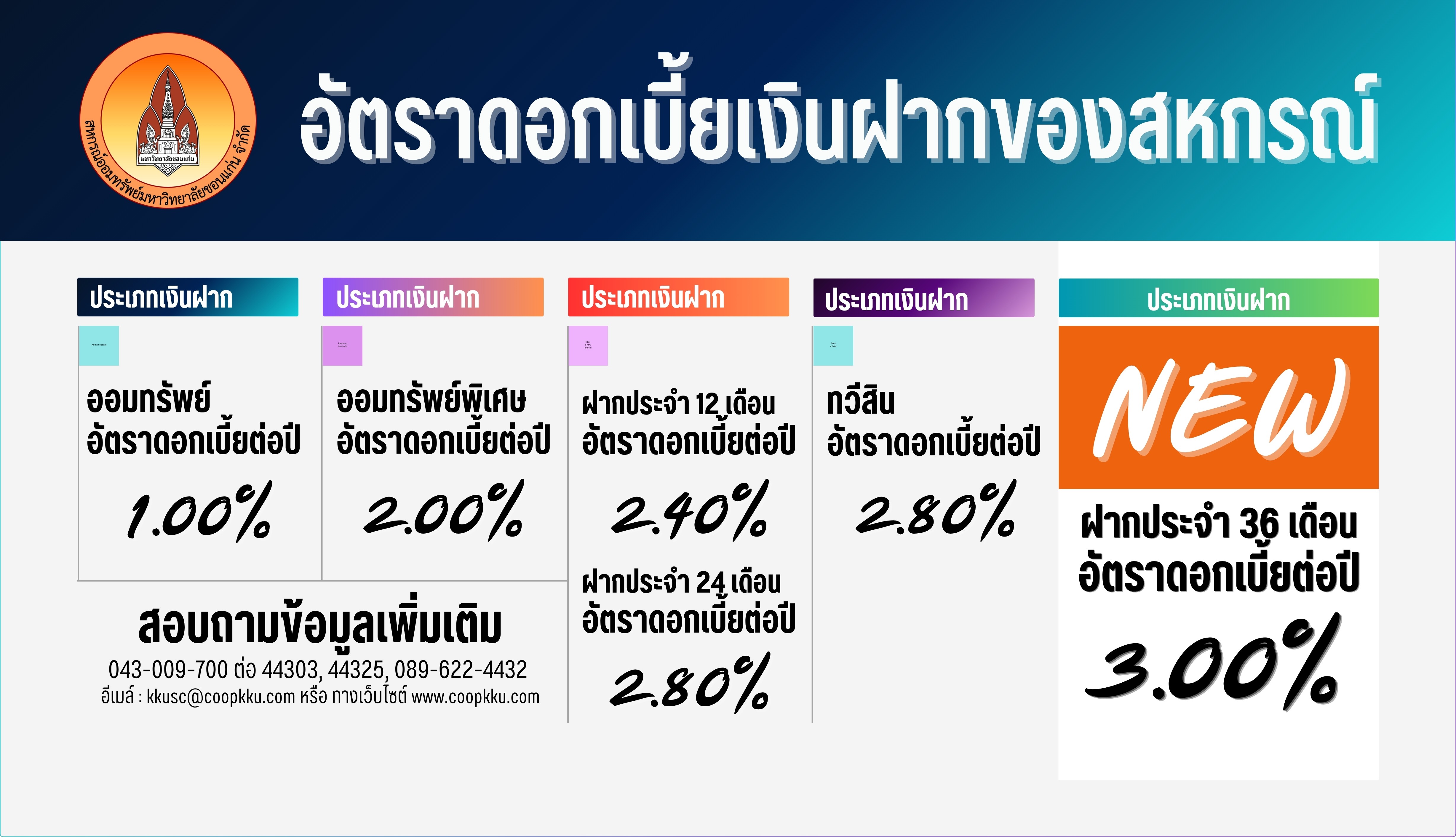 เพื่อให้การบริหารงานของสหกรณ์ออมทรัพย์มหาวิทยาลัยขอนแก่น จำกัด เป็นไปด้วยความเรียบร้อย เหมาะสม ส่งเสริมการออมของมวลสมาชิก และสอดคล้องกับสถานการณ์ทางเศรษฐกิจในปัจจุบันอาศัยอำนาจตามความในข้อ 75(14) แห่งข้อบังคับสหกรณ์ออมทรัพย์มหาวิทยาลัยขอนแก่น จำกัด พ.ศ.2568 และระเบียบสหกรณ์ออมทรัพย์มหาวิทยาลัยขอนแก่น จำกัด ว่าด้วยการรับฝากเงิน พ.ศ. 2569 และฉบับแก้ไขเพิ่มเติม ประกอบกับมติที่ประชุมคณะกรรมการดำเนินการ ชุดที่ 47 ครั้งที่ 6/2569 เมื่อวันที่ 27 มีนาคม 2569 มีมติเห็นชอบกำหนดอัตราดอกเบี้ยเงินฝาก ดังนี้